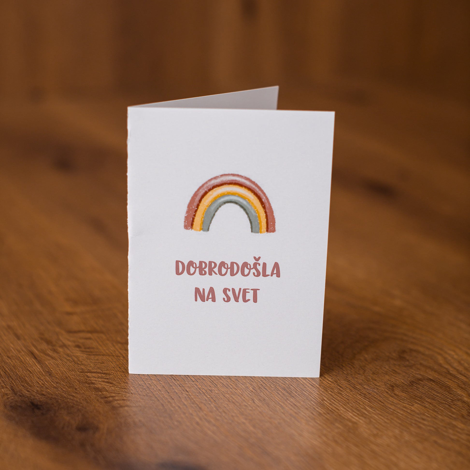 Čestitka z ilustracijo škorenjčka, "Dobrodošel na svet!"