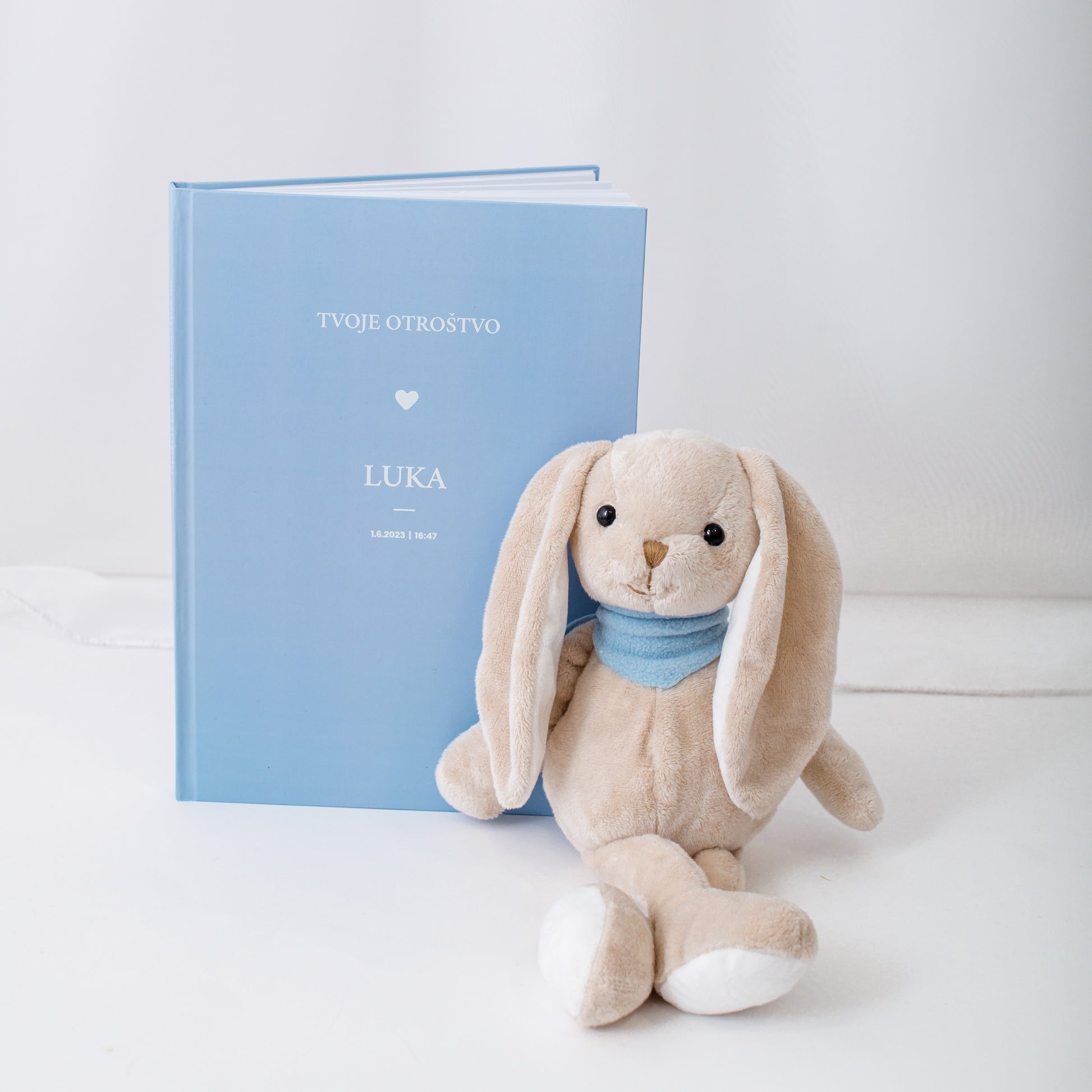 Razveselite družino ob rojstvu otroka s tem čudovitim darilnim setom, ki vključuje ljubkega personaliziranega zajčka in čarobno beležnico. Ta edinstvena kombinacija bo ustvarila nepozabne trenutke v prvih letih otrokovega življenja.