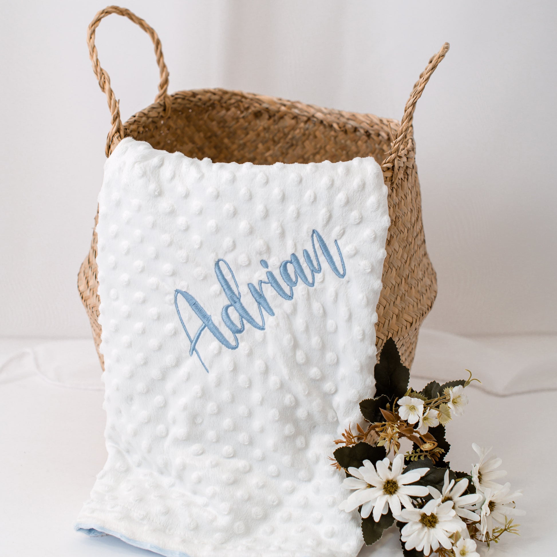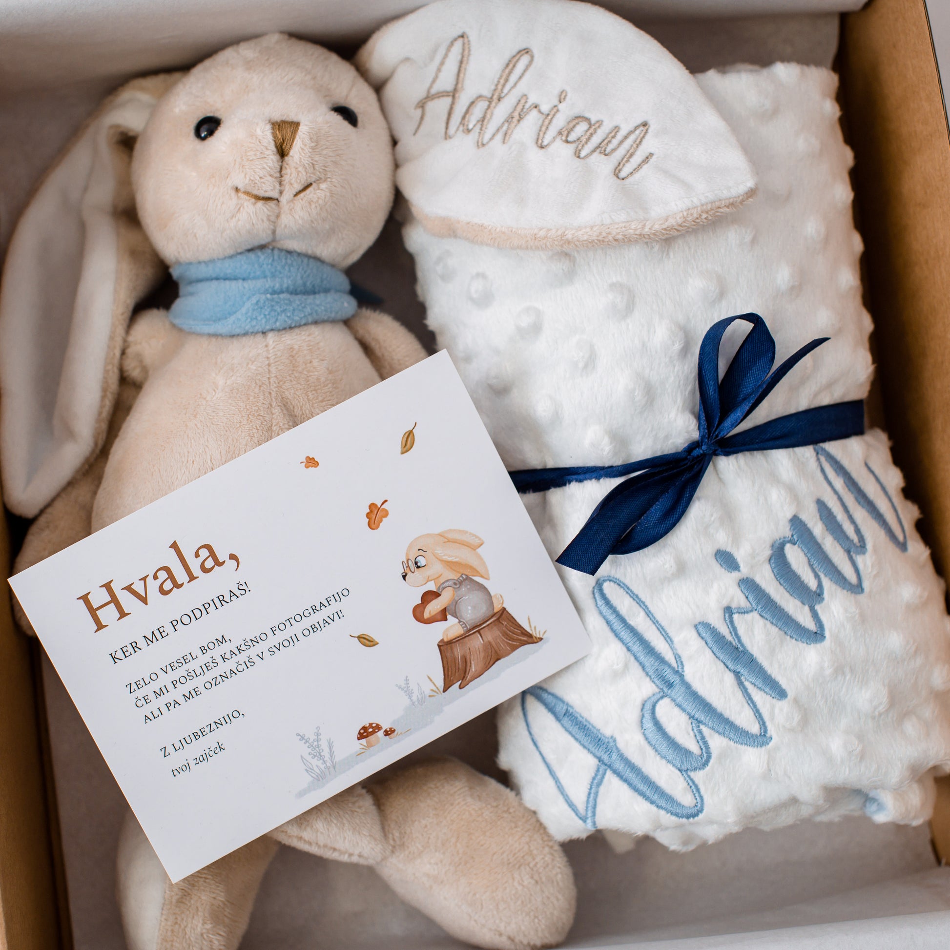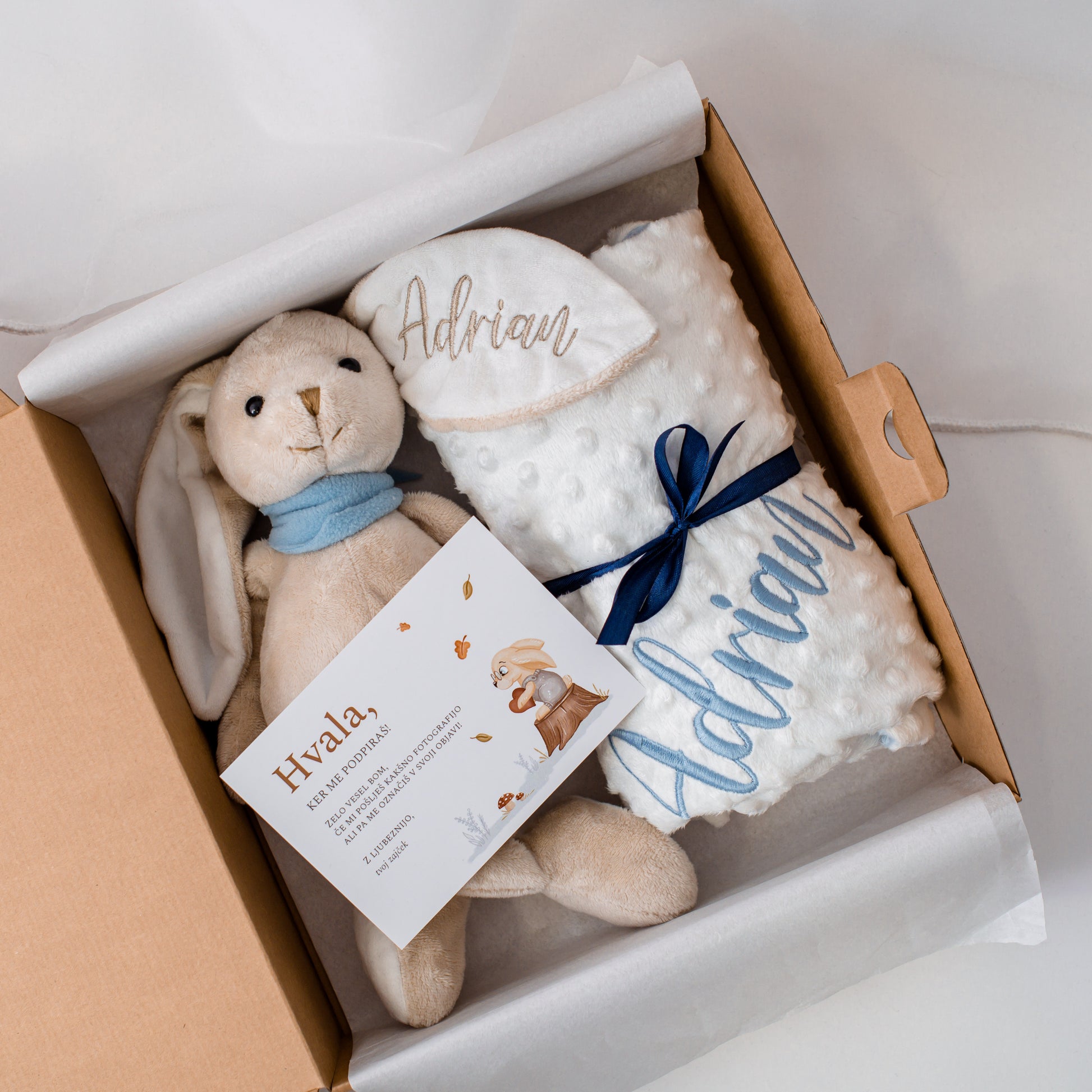 Razveselite novopečeno mamico in dojenčka s tem izjemnim darilnim setom, ki vsebuje čudovito personalizirano modro-belo odejico in mehkega zajčka z modro rutko. Ta edinstvena kombinacija bo nežno objela dojenčka in ustvarila nepozabne spomine v prvih mesecih in letih njegovega življenja.