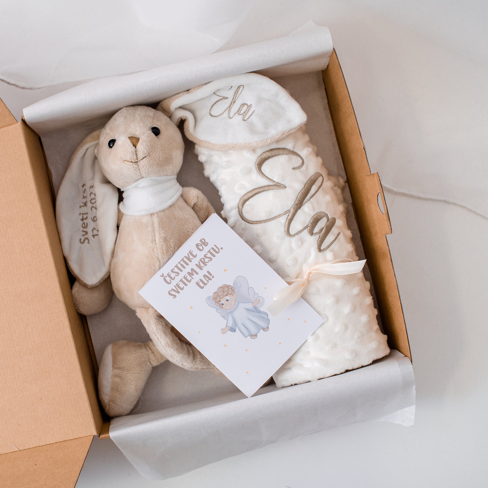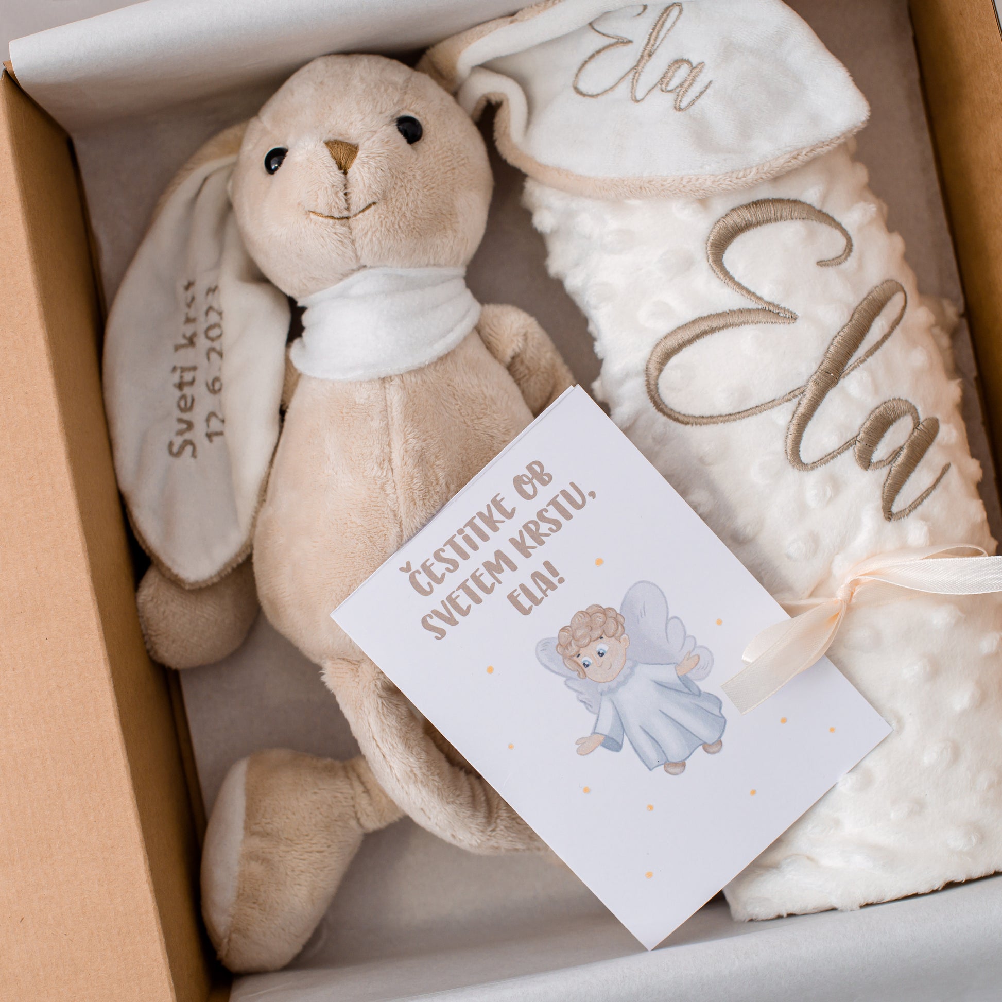 Poleg zajčka in odejice temu setu pripada tudi personalizirana čestitka za Sveti krst, ki jo izpolnete sami.