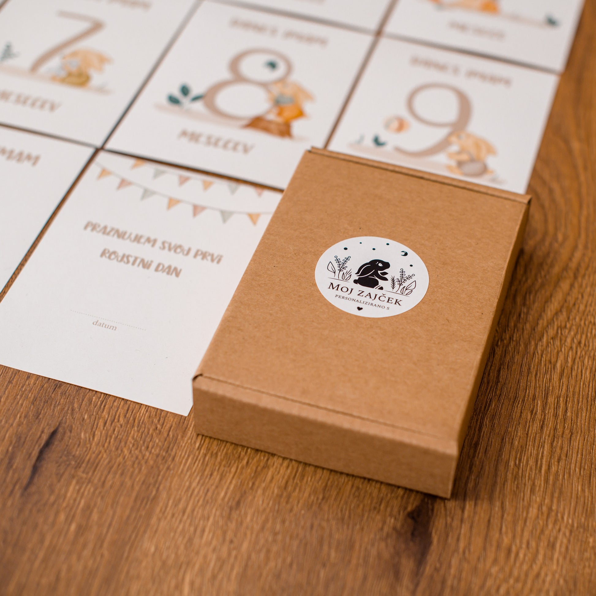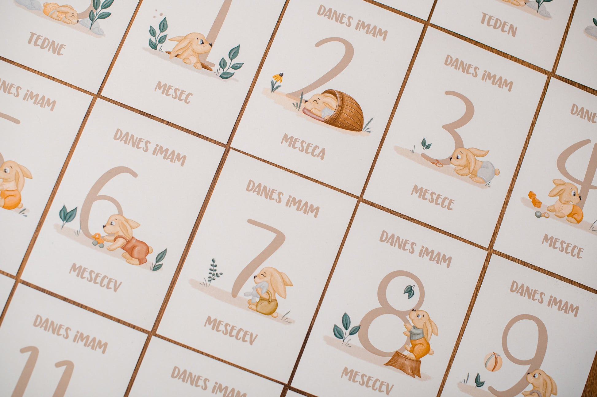 Komplet kartic mejnikov za prvo leto vašega dojenčka z motivi zajčkov.