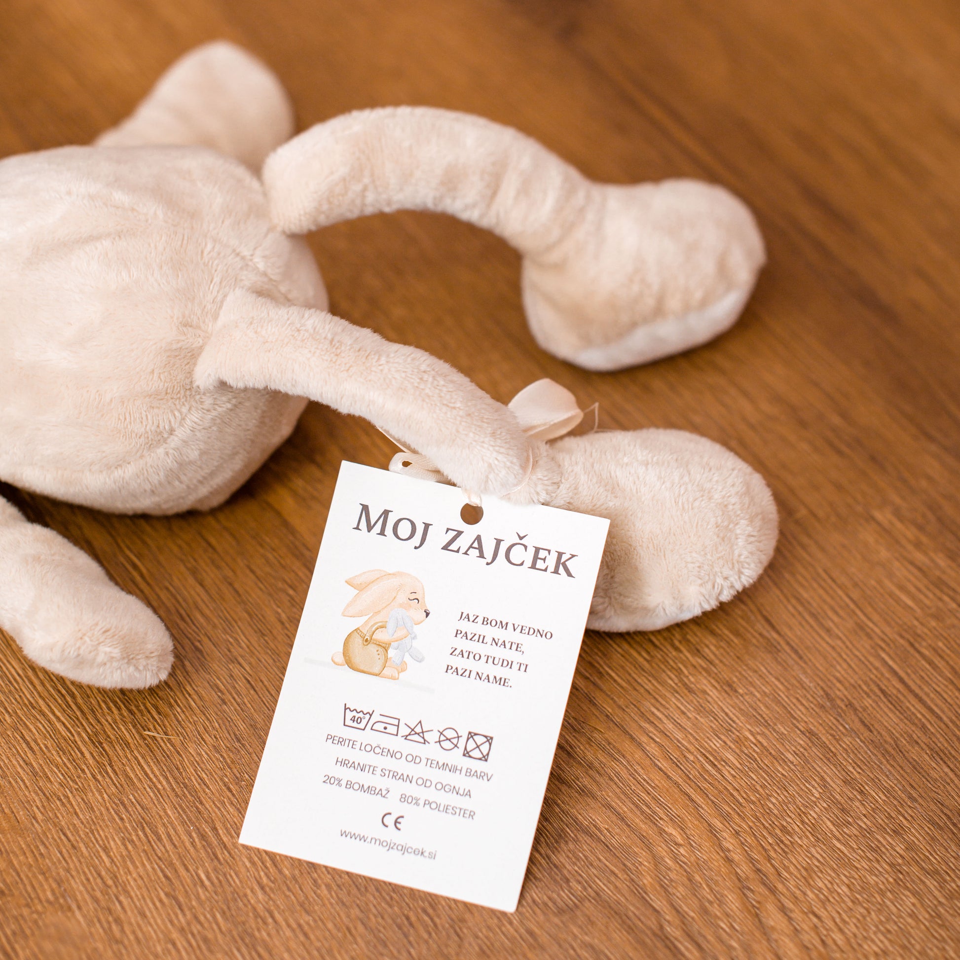 Poleg zajčka lahko prejmete tudi čudovito personalizirano pravljico o tem kako sta se zajček in otrok spoznala, ki razkriva skrivnost, zakaj ima zajček na ušesu prav otrokovo ime.