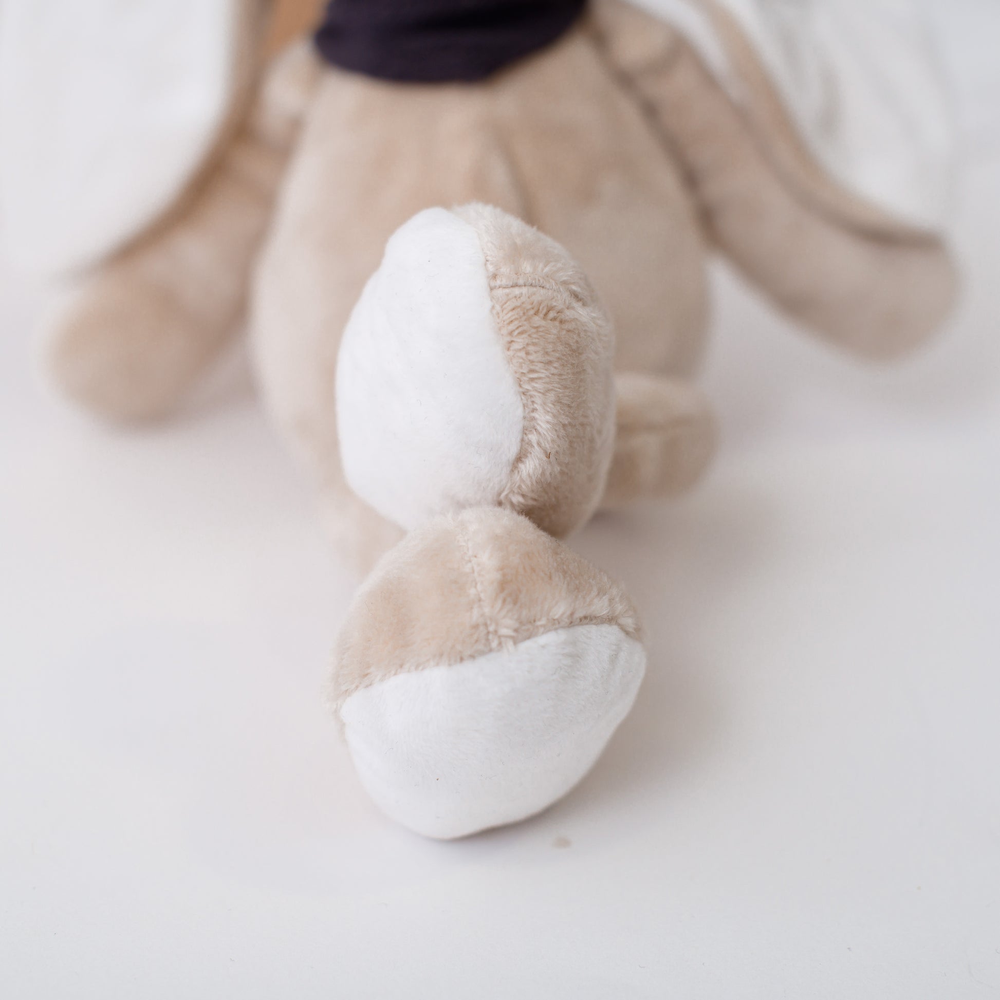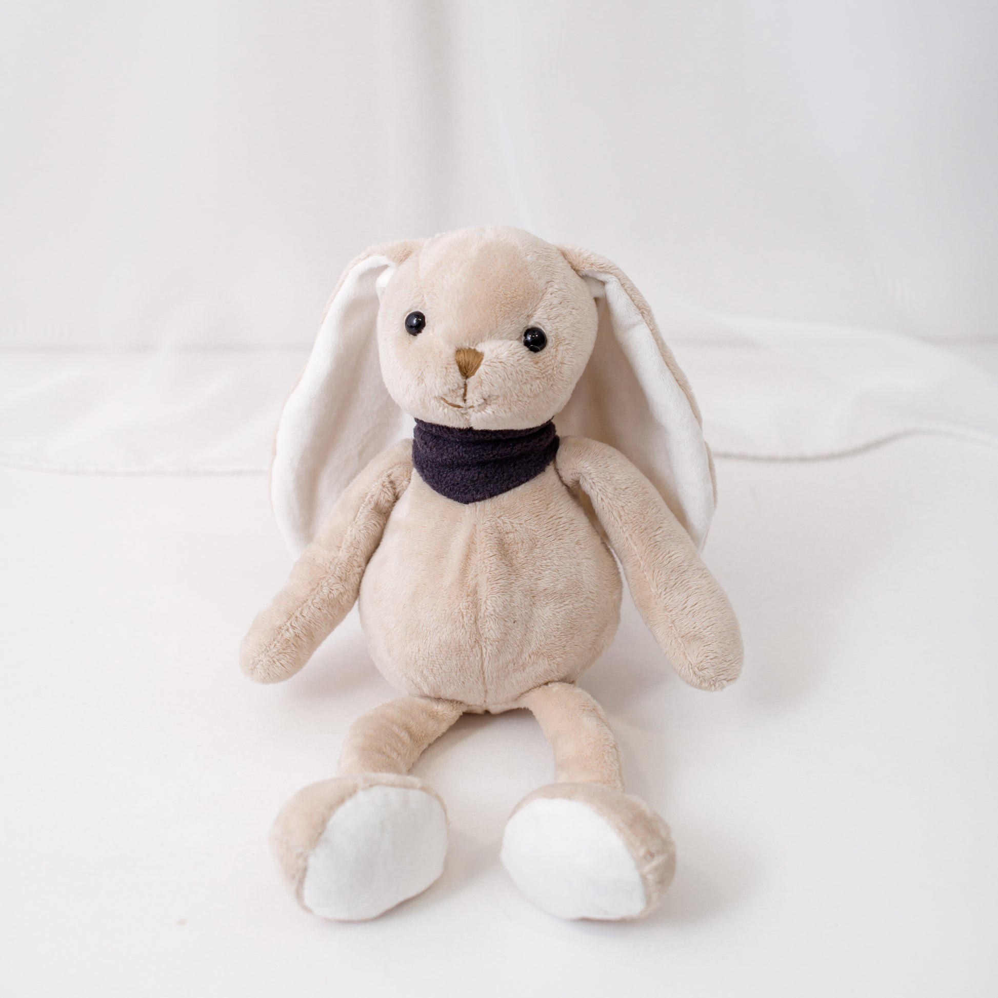 Naš zajček je izdelan v nežni bež barvi, z belimi tačkami in notranjimi ušesi. Njegov smrček vedno nosi nežen nasmeh, saj je vesel, da ste ga izbrali. Rutka, ki jo nosi okrog vratu, je sive barve.