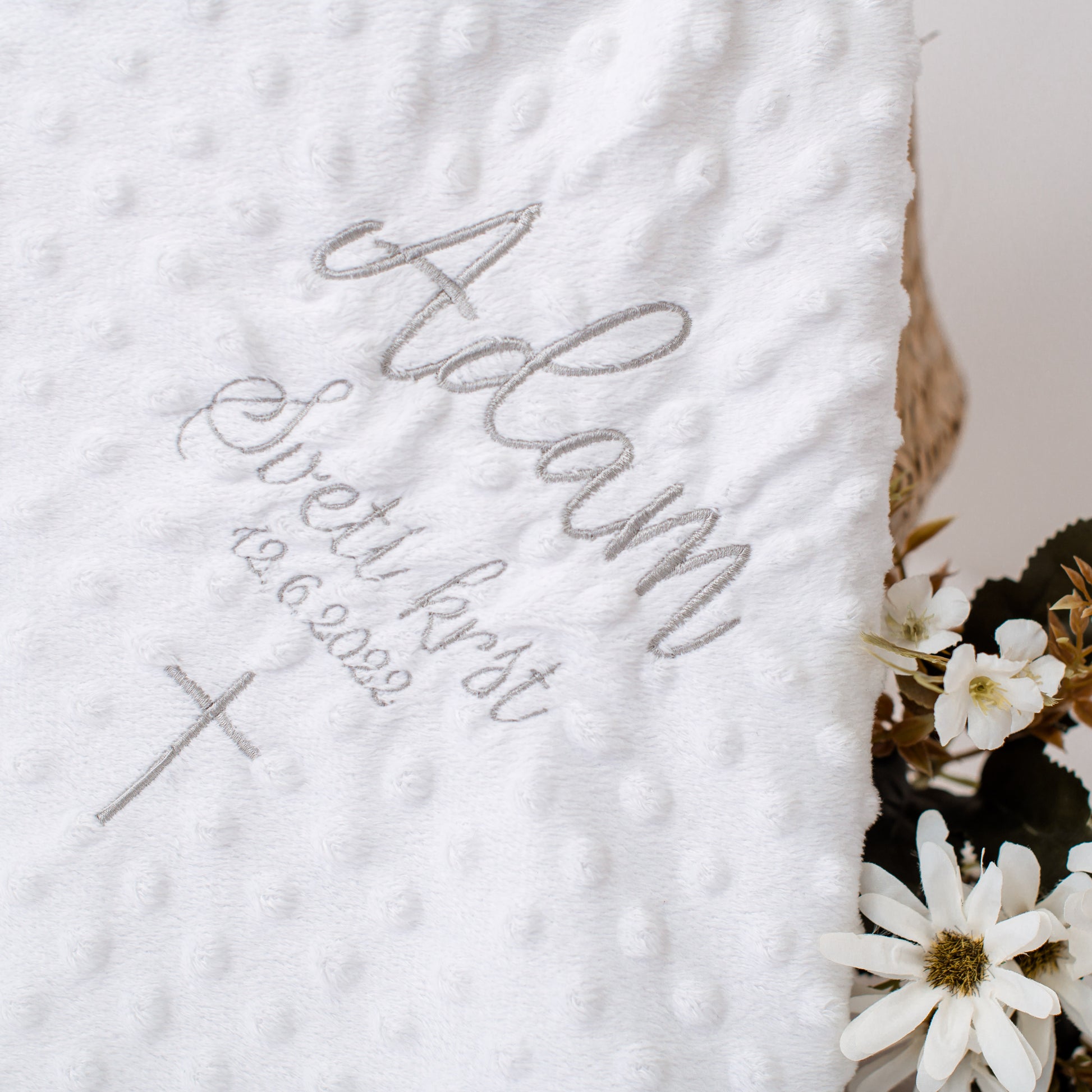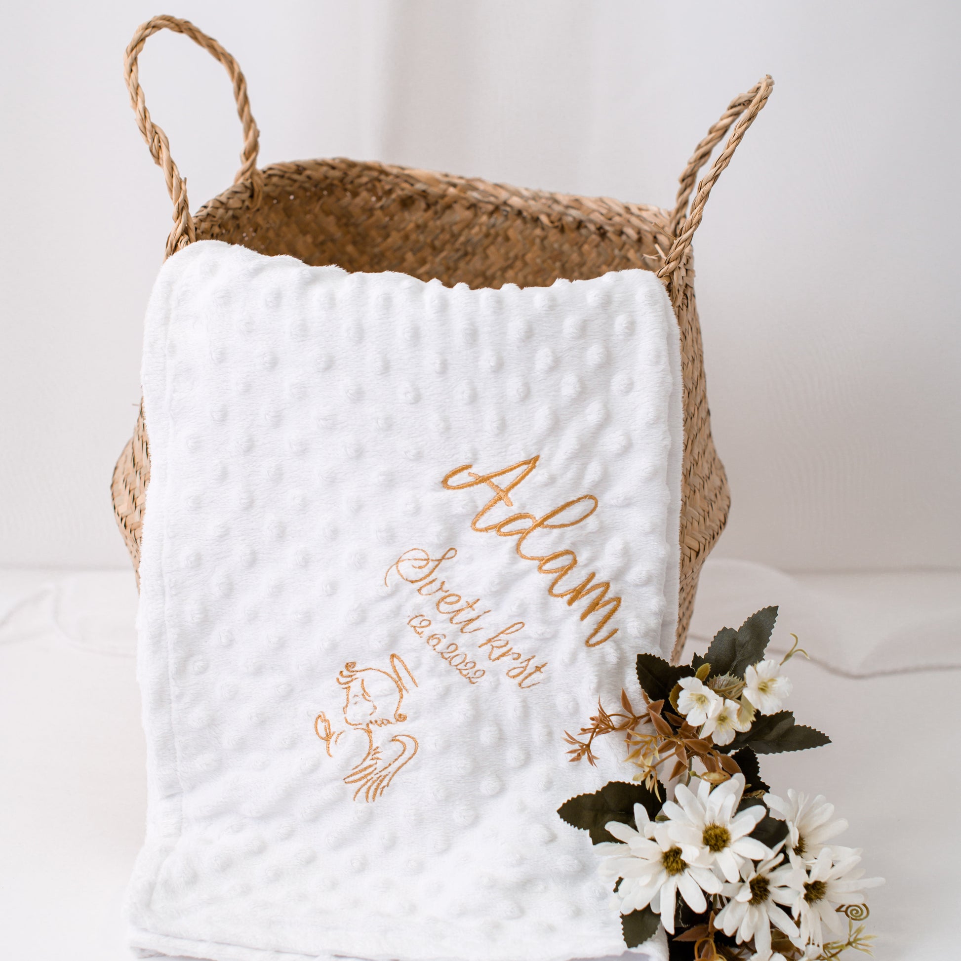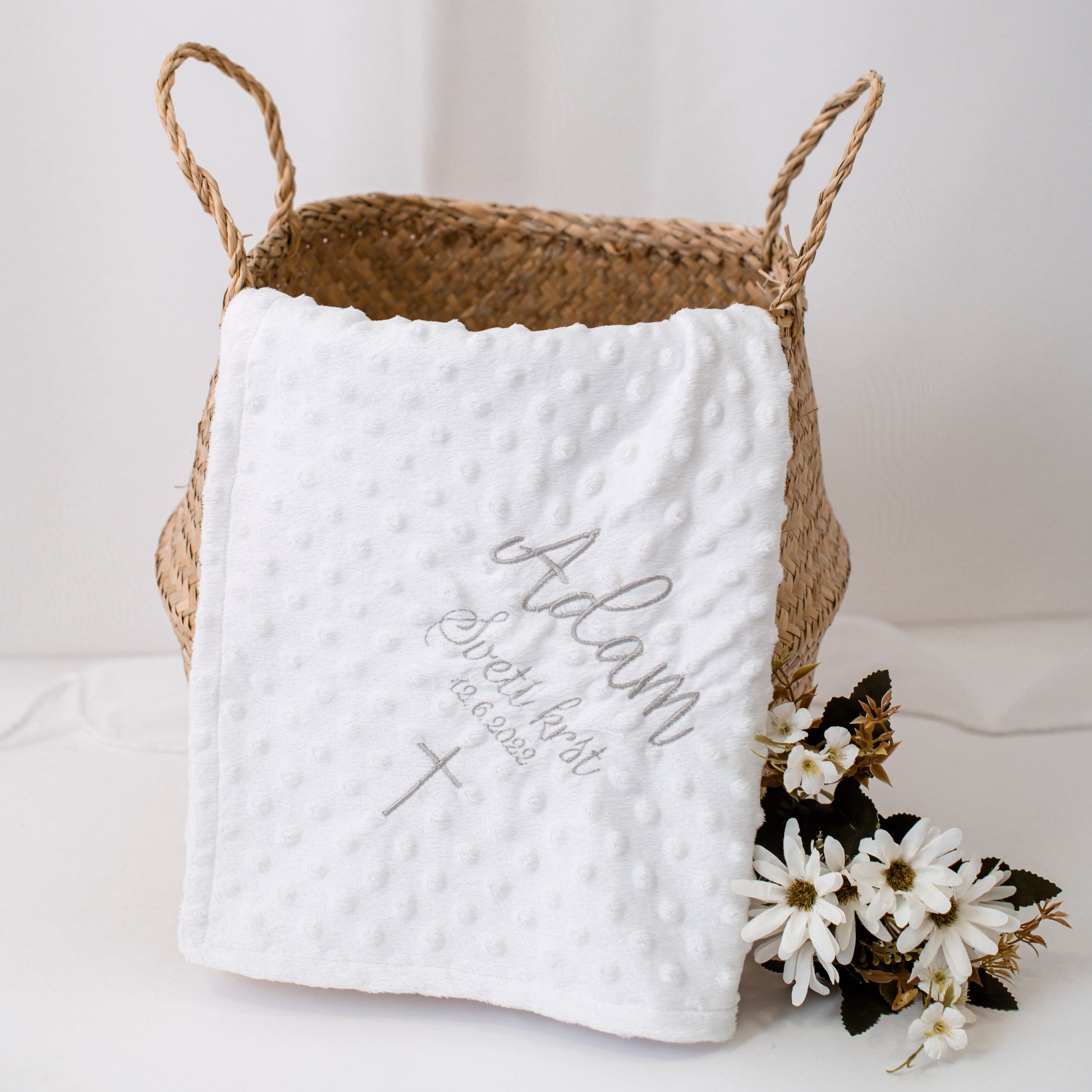 Ta personalizirana odejica za dojenčke je več kot le vsakodnevni izdelek - je simbol ljubezni, nežnosti in skrbi za vsakega dojenčka. Ko ga ovijete v to mehko odejico, bo vaš dojenček občutil neverjeten občutek udobja in varnosti. Vsak trenutek preživet v njenem objemu bo popolna priložnost za ustvarjanje čudovitih spominov. Nežna bela barva blaga se čudovito poda k vsaki otroški posteljici ali vozičku.