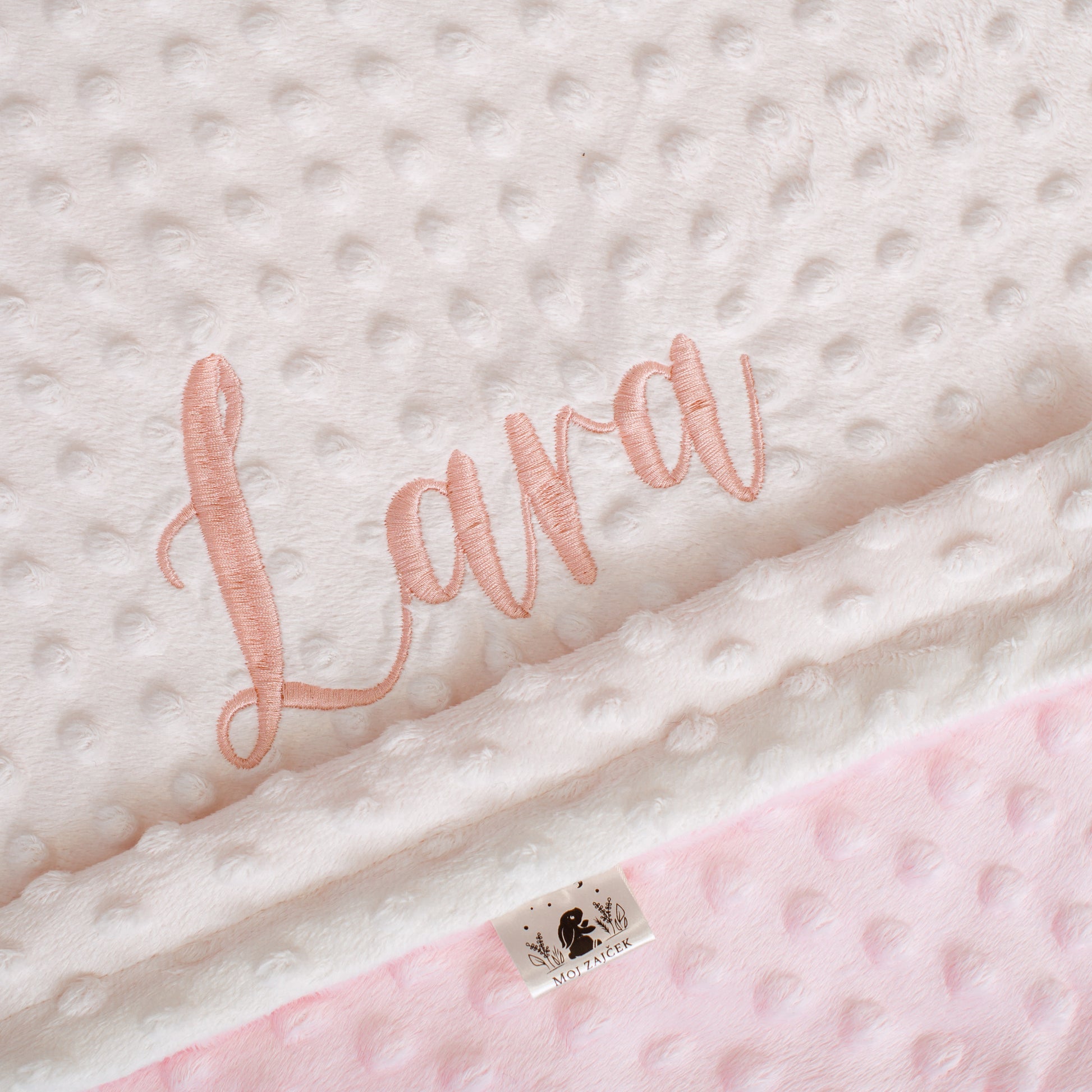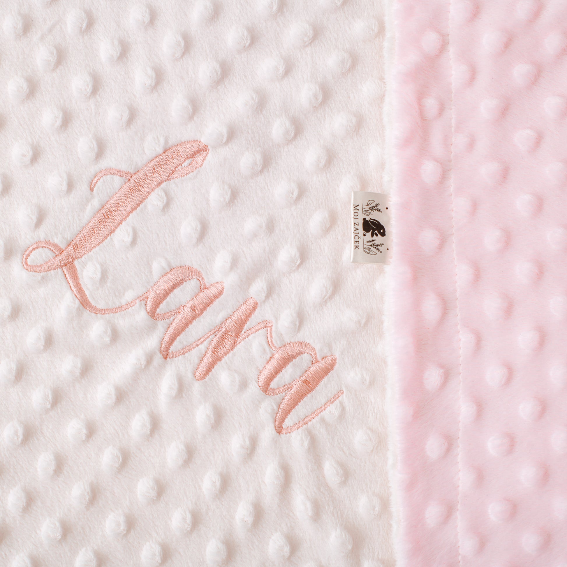 Ta personalizirana odejica za dojenčke je več kot le vsakodnevni izdelek - je simbol ljubezni, nežnosti in skrbi za vsakega dojenčka. Ko ga ovijete v to mehko odejico, bo vaš dojenček občutil neverjeten občutek udobja in varnosti. Vsak trenutek preživet v njenem objemu bo popolna priložnost za ustvarjanje čudovitih spominov. Nežna bela in roza barva blaga se čudovito podata k vsaki otroški posteljici ali vozičku.